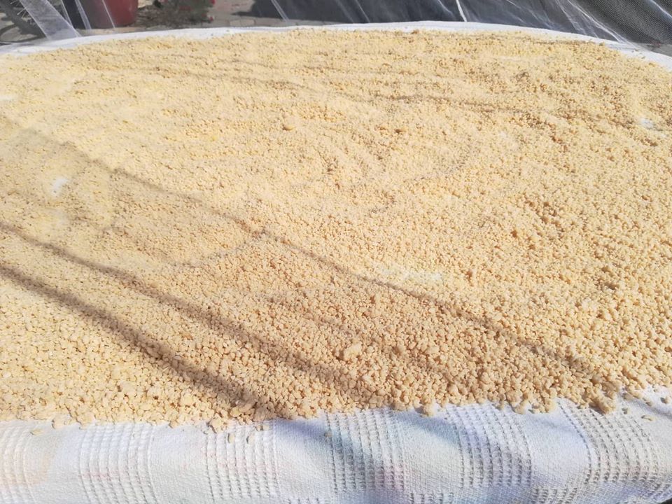 The preparation of trahana begins in the first months of summer, a period of the agricultural cycle during which there is an excess of milk. It is the right time to dry, pack and be ready for the coming winter. The last stage is drying it over a large area for at least a week. When the materials are mixed, they are broken into irregular pieces, dried and then crushed into smaller granular pieces or passed through a sieve to achieve the same texture.