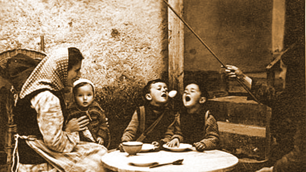 When the plates are removed there follows an amusing game called ‘amkaje’ and corresponding to the the Celtic festival Samhain, of “Bobbing for Apples” at Halloween time, which was a Gaelic celebration that marked the end of harvest season and the beginning of winter. Similarly, the Macedonian game of ‘amkaje’ corresponds with the end of winter and the birth of spring. A long thread is tied to the end of a stick or the ceiling, and from it is suspended a bit of confectionery, or a boiled egg. The person that holds it bobs it towards the others who sit in a ring, with their mouths wide open, trying to catch the morsel by turns. Their struggles and failures naturally cause much jollity and the game soon gets exciting. This amusement is succeeded by songs sung round the table and sometimes by dancing.