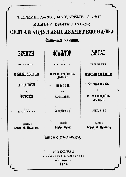 Title page from Pulevski’s Three Language Dictionary (Belgrade, 1875)