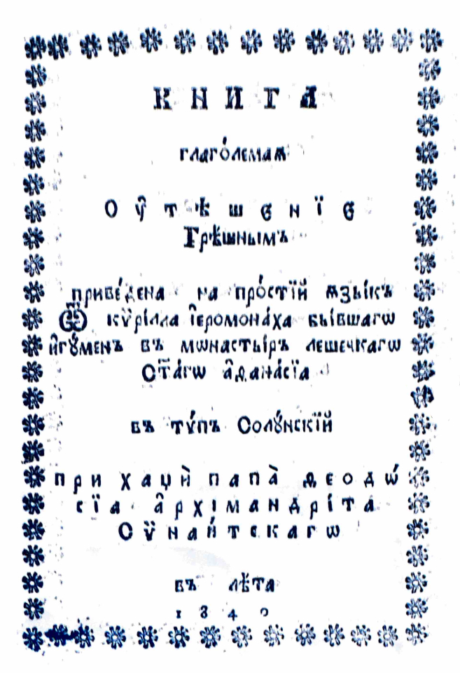 Determined to see his work published, Pejčinovik’ approached several publishers before turning to Teodosija Sinaitski, who had established the first printing press in Salonika for books in the local language. When the press was destroyed by fire in 1839, Pejčinovik’ helped finance its rebuilding. In gratitude, Sinaitski published Comfort to Sinners at the newly restored press in 1840. This modest 47-page book was dedicated to educating Pejčinovik’s congregation and includes an introduction by Sinaitski, followed by Pejčinovik’s teachings and a collection of prayers.