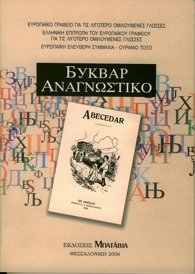 Greek state. (1925). The primer “ABECEDAR”, prepared by a special government commissioner was published by the Greek government in Athens in 1925, intended for the Slavic speaking Macedonian minority children in Greek Macedonia to learn their native language in school [Image of book “ABECEDAR” ]. wikipedia. https://el.wikipedia.org/wiki/Abecedar#/media/%CE%91%CF%81%CF%87%CE%B5%CE%AF%CE%BF:Abecedar_1925_frontpage.jpg