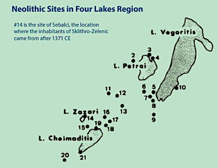Red dot indicates the location of a Neolithic site on Lake Zazari. This is the site of the original location of the settlement called Sebaltsi/Seblatsi where the inhabitants of Zelenich came from and later (1385/6) settled in present day Sklithro.